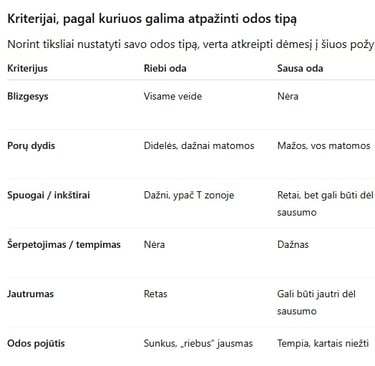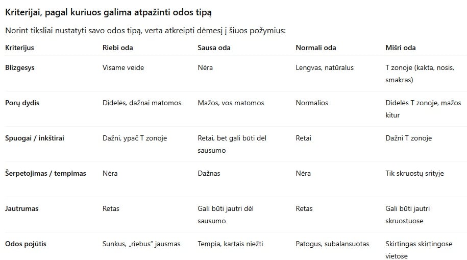 Mišri oda: T zona (kakta, nosis, smakras) riebi, o skruostai – sausesni ar normalūs (jei yra šiek tiek drėgmės trūkumas, gali jaustis lengvas tempimas)